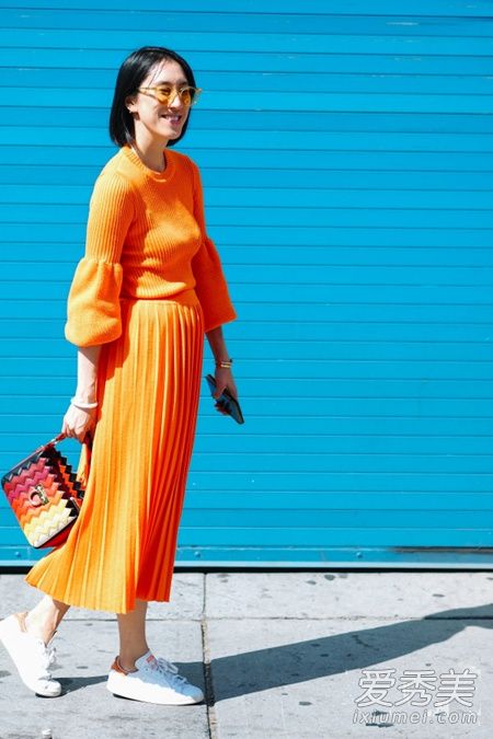 因为天气仍然有点凉,比膝盖长的褶裥裙子更受大家欢迎。穿长裙担心会变矮吗?事实上,它看起来和一双平底鞋一样好。一条褶皱很强的裙子和小白鞋会在几秒钟内让年轻女孩的风格焕然一新,而高饱和度的橙色也会让你焕然一新。