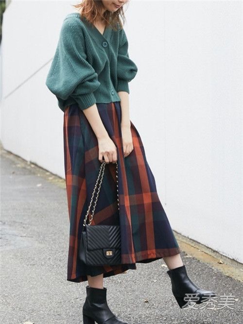 今年,穿短针织夹克作为上衣非常流行。这款特殊的蓝绿格子图案连衣裙看起来既时尚又时尚。~可以搭配运动鞋或黑色厚跟靴,以展现休闲感~
