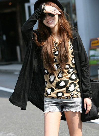 不规则的豹纹设计与不显眼的圆领相结合,使得整体的时尚感大大增强!戴着酷酷的手镯和黑色超级雅皮士帽子,感觉像朋克吗?哈哈。街头时尚女孩太酷了!穿皮革牛仔短裤也很出众。