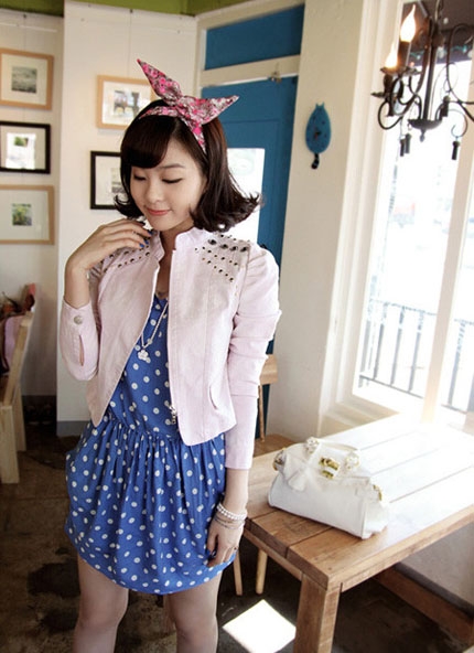 白色的短外套看起来没什么特别的,但是精致的铆钉装饰引领了今年的主流潮流,可爱的小泡泡肩展现了少女的可爱气息。
