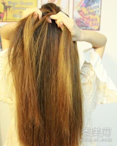 第二步:编织第二段时,从辫子的左右两边取一束头发,加到每一束头发上,这相当于增加了原来那束头发的重量,也就是蝎子辫子的编织。