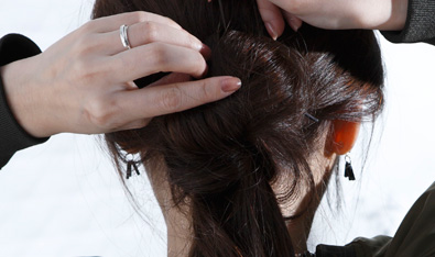 用你的手在后杓骨的位置梳理出一条低矮的马尾。