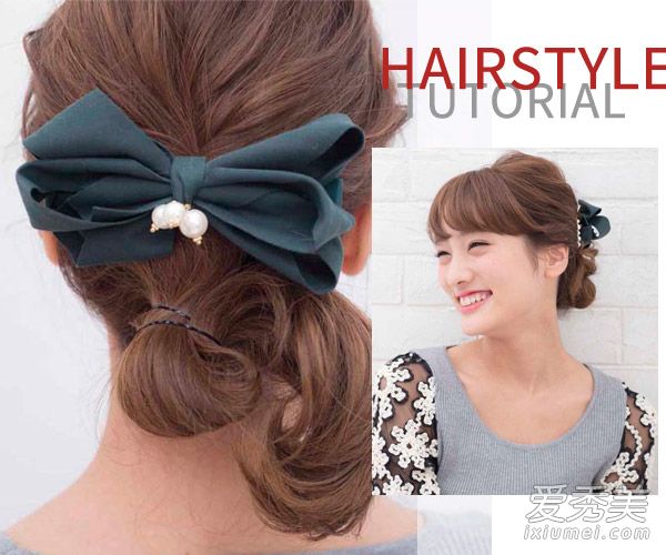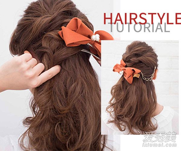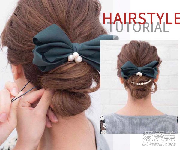 最后,用一个造型精美的大蝴蝶结发夹将两束发束固定在一起。固定位置可向一侧倾斜,另一侧附有装饰链,使发型更生动。