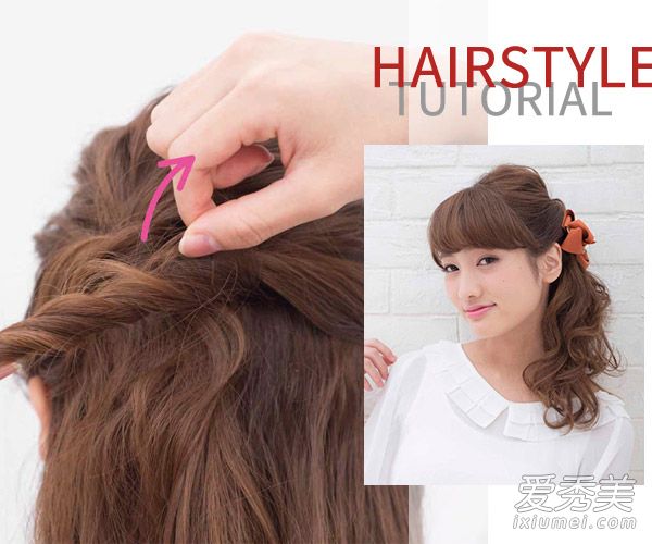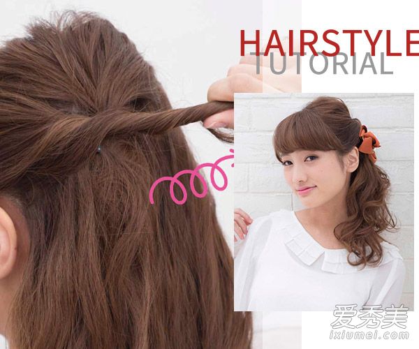 以耳朵为分界线,将耳朵上方的头发拢在脑后,拧出一个结。注意保持头顶的头发蓬松,并用蝴蝶结发夹固定。