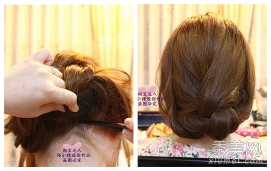根据第五段完成后,用一个大吹风机将下面的头发卷到顶部进行缠绕。