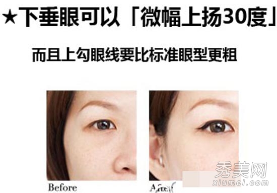 下垂的眼睛可以“略微上升30度”,下垂眼睛的上勾眼线比标准眼型要粗,这样眼线就不会在睁开眼睛后被眼睑“吃掉”!