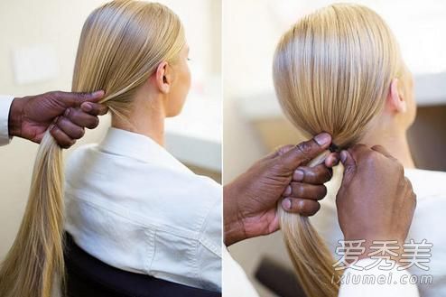 第一步:将两边耳朵附近的头发分开,将剩下的头发在脖子上方扎成一个低马尾。