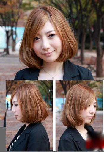 这个发型设计是蓬松的鲍勃的发型,留着整齐的刘海,看起来可爱又甜美。这种款式与这种胖脸MM非常相配,这是胖脸MM必须选择的款式!