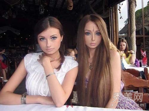 “真正的芭比”(左)和她的母亲(中)以及“芭比姐妹陶”一起出去。valeria lukyonova .