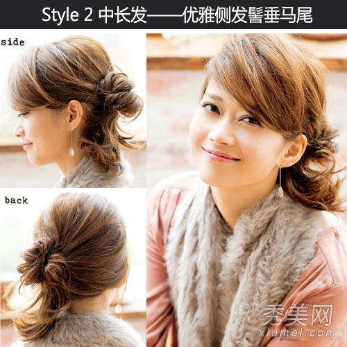 2.中等长度的头发——优雅的侧发髻,马尾垂下