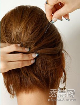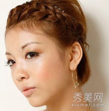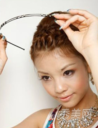 在靠近前额的头顶,用手自然地抓一束,从右向左或从左向右编织。编织后,用发夹固定。