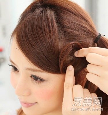 第四步:把头发绑在上面,像球头一样向前向内卷,稍微收紧,用黑色的U形夹固定。