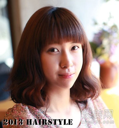 整洁的刘海搭配内扣,展现出甜美可爱的气质,凸显出那双大而灵活的眼睛。富有弹性的卷发让模特看起来非常可爱,同时还能遮住脸上的肉。