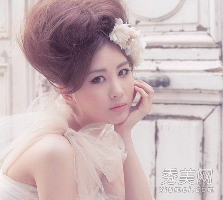 爆米花发型的柔和夸张版本。可爱整洁的刘海,大边随意形成一种自然的感觉。发型优雅可爱,配有党建珍珠发带。