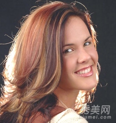 多色亮点,浪漫的长卷发卷曲在胸前,为你收获爱的喜悦,长刘海在精心修饰的脸的中央。