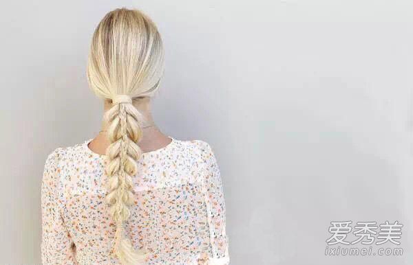 第八步:取下长颈夹,然后开始用原来分开的头发编三绺头发。当头发被编到需要分配的位置时,所有的头发将被编成三束。