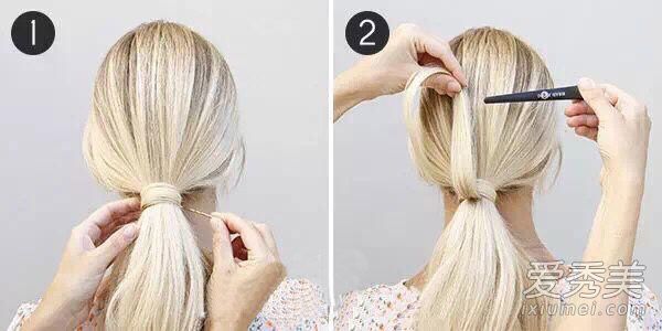 第四步:在橡皮筋上方的头发中间分开一个洞。