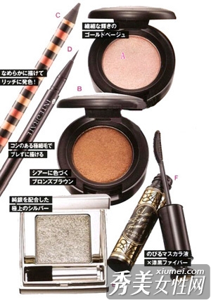 蘸上眼影,刷在头上。 第五步:用小眼影刷蘸上E色(包括亮片)眼影,刷在眼睛头上,让整个眼妆变亮。