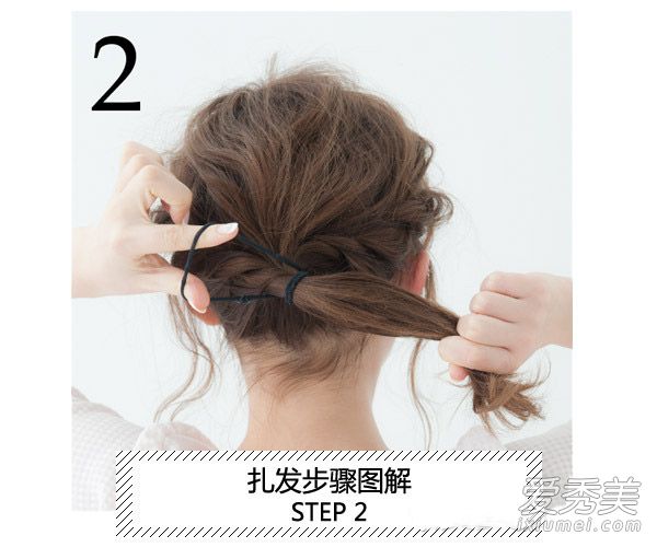 第二步:头发的下部也扎成马尾辫,然后翻过来。注意前面的组合。然后用一只手按住扎好的发胶带,用另一只手轻轻拉出头发,使头发变得凌乱蓬松。