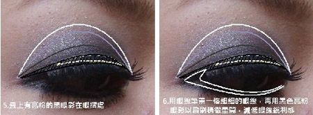 将黑亮粉眼影折叠在眼袋上,双眼皮贴合后加强眼袋的深度,然后用眼线画一条细眼线,再用黑亮粉眼影将眼影稍微弄晕。