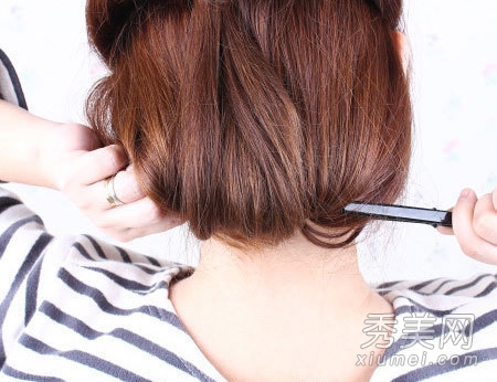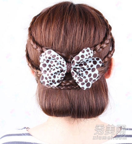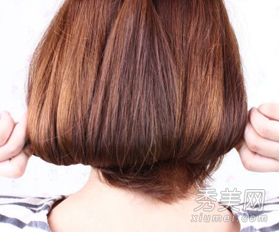 将左耳的辫子尾固定在右耳内层的头发上。左右操作是相同的。
