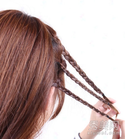 将分开的耳朵旁边的发束编织成3根发辫,左右操作相同。
