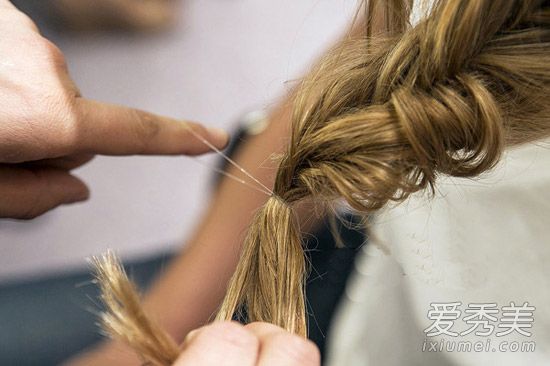 耳朵后面的头发垂直于胸部,另一个区域的部分头发被分开,耳朵后面的头发被制成两股夹子,它们被编织到头部后面的位置。对于初学者来说,如果很难控制侧边编织的技巧,你也可以从脑后开始编织头发,并把它放在肩侧。