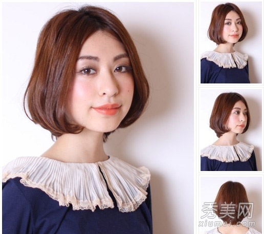 带有内扣的短发显示出浅棕色的头发颜色,侧面刘海被剪开,给人一种轻盈而丰满的感觉。内卷梨花头的简单形状显示出娇小的效果。