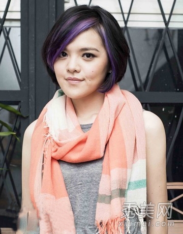 天生不完美的脸型,大额头和多肉的脸,哪个发型重要并不重要。斜刘海的短发风格自然有很强的内卷发和烫发修饰,刘海上的紫色高光更增添个性。