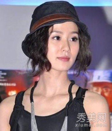 带有强烈时尚感的短波浪卷发,深色牛仔布和皮革拼接的帽子,很好地凸显了邻家女孩的亲和力,整体美观时尚。