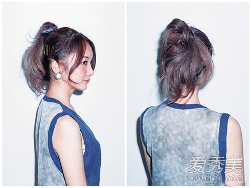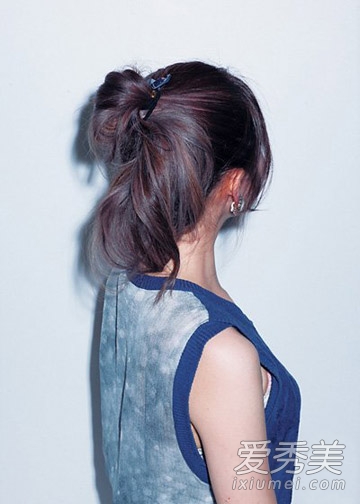 1.将头发在高处对折,留下一长段头发用装饰好的头绳绑成球头。