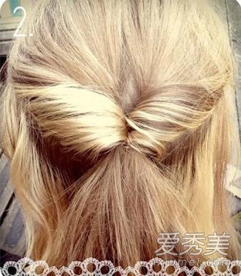 第三步:将第二层的头发分成左右两部分,将翻好的发束也分成同样的两部分,分别与下层的头发绑在一起。