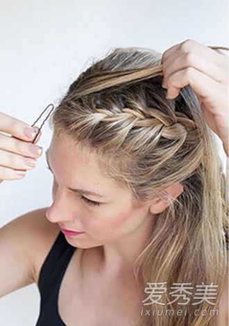 1.你应该把你的头发编成蝎子辫子。准备一个U形夹。在蝎子辫子旁边的发带里挑一缕头发。