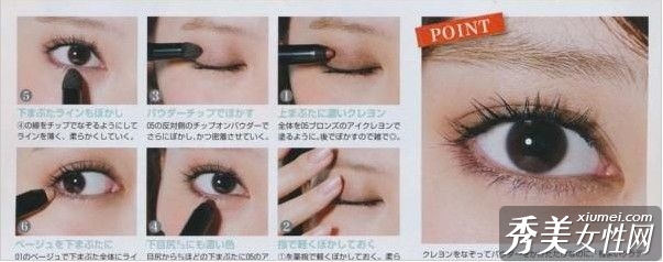 双眼皮眼睛的折叠线涂有水平的长土色调眼影,然后眼睑从眼尾向下呈“ㄊ”形交叉。