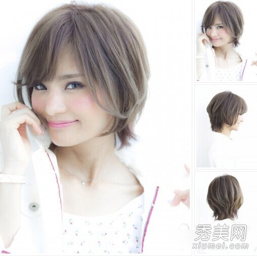 灰棕色的头发颜色充满魅力,简单的斜刘海搭配不规则的烫发风格,短短的头发立刻变得很有个性。