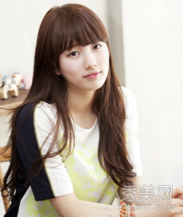 一个非常女性化的韩国女孩的卷发风格。蓬松的长卷发加上整齐的刘海非常适合修饰国民性脸型,瞬间拉长脸型,展现瘦脸气质。