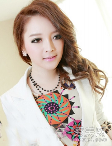 卷发画用细刘海遮住肥胖的圆脸,而蓬松卷发画体积适中,迷人的奶茶棕色,清新明亮,凸显淑女气质。