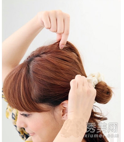 第一步:将头发分成上下两部分。把头发的上半部分扎成马尾辫。当用发圈系头发时,不要把所有的头发拉出来,直到第三圈,留下一部分发尾,如图所示。然后用你的左手松开你的头顶。