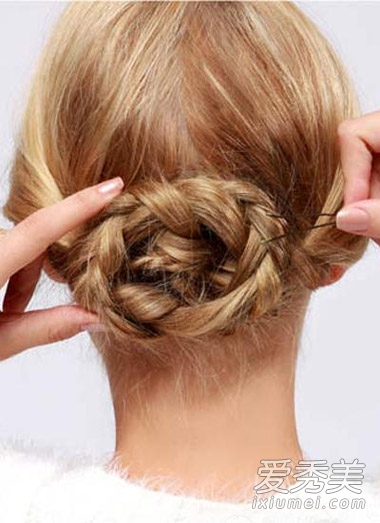 第四步:然后把剩下的发辫放在刚才的发髻上,再绑上。