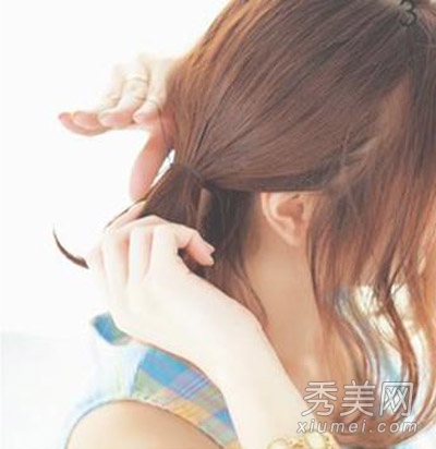 4.最后,可以用手轻轻拉动扭曲到后脑勺的两股头发,拉长脸型,使整个发型更加立体。