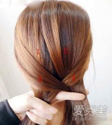 2.从最右边抓住一小段头发,向左拉,同时下面的头发保持不动。