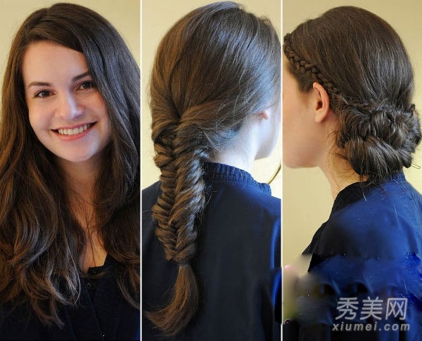 把长发编成鱼尾。如果你不知道鱼尾纹的具体方法,你可以搜索教学视频,清楚地看到具体的操作方法。