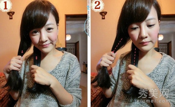 步骤3:从2的内侧取出一束头发,放在1上,然后从1的外侧取出一束,放在2上。