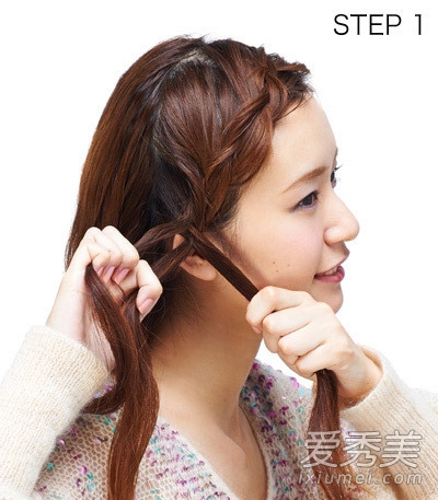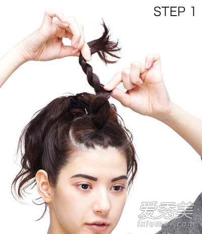 第一步:去掉前额的刘海,把它们拧成两条蓬松的发辫。