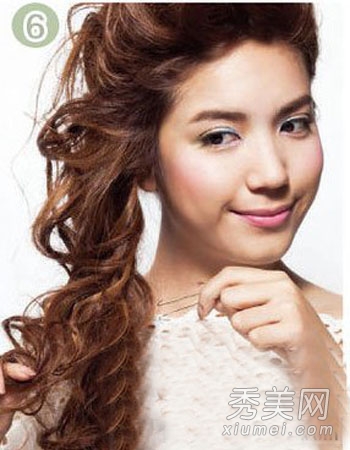 第六步:进入漂亮发型扎结步骤的最后一步,用手将卷曲的头发自由地缠绕在三股辫子上,然后用发夹固定发梢。