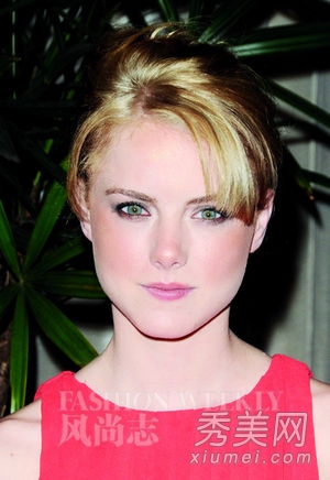 高高扬起的眉毛特别迷人,冰蓝色的眼影在眼睛周围很亮,突出了睫毛的卷曲和浓密。湿润的粉红色嘴唇只需要淡淡的唇彩。