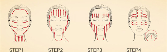 4.首先,用美容手指+美容助手指腹从内到外滑动,在眉毛上方滑动两次,以太阳穴为终点,然后用美容手指指腹按压穴位,每个穴位保持2秒钟!