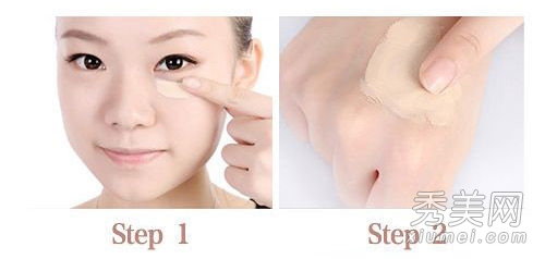 第一步:将具有保湿效果的橙色遮瑕膏均匀涂抹在黑眼圈上。