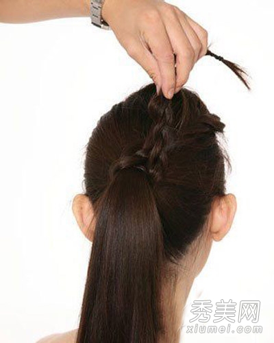 第五步:编织好头发后,将尾端缠绕在马尾结上。