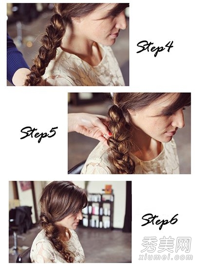 第四步:修剪并拉长留在脑后的头发,做简单的松散编织。